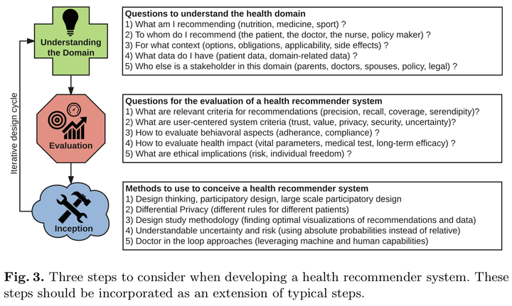 Recommender systems are a classical example for machine learning applications, however, they have not yet been used extensively in health informatics and medical scenarios. We argue that this is due to the specifics of benchmarking criteria in medical scenarios and the multitude of drastically differing end-user groups and the enormous context-complexity of the medical domain. Here both risk perceptions towards data security and privacy as well as trust in safe technical systems play a central and specific role, particularly in the clinical context. These aspects dominate acceptance of such systems. By using a Doctor-in-the-Loop approach some of these difficulties could be mitigated by combining both human expertise with computer efficiency. We provide a three-part research framework to access health recommender systems, suggesting to incorporate domain understanding, evaluation and specific methodology into the development process.